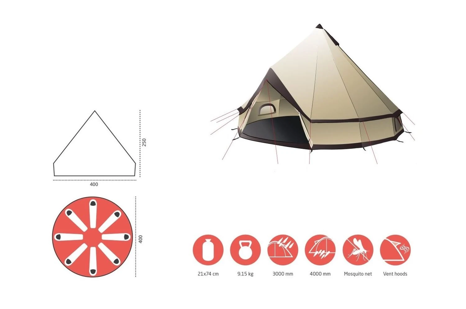 Das Grand Canyon Indiana 8 Zelt ist ein klassisches Rundzelt mit einer senkrechten Mittelstange und einem vormontierten A-Rahmen zur Stützung des großen Zelteingangs. Es bietet Platz zum Schlafen für bis zu 8 Personen oder ausreichend Platz als Treffpunkt am Tag für größere Gruppen. Die eingenähte Bodenwanne schützt vor Insekten und garantiert ein einfaches Aufbauen des Zeltes. Die großen Belüftungsöffnungen mit Abdeckung und die Moskitonetze auf der Außenplane sorgen für eine hervorragende Luftzirkulation und ein stets angenehmes Raumklima im Innenzelt.