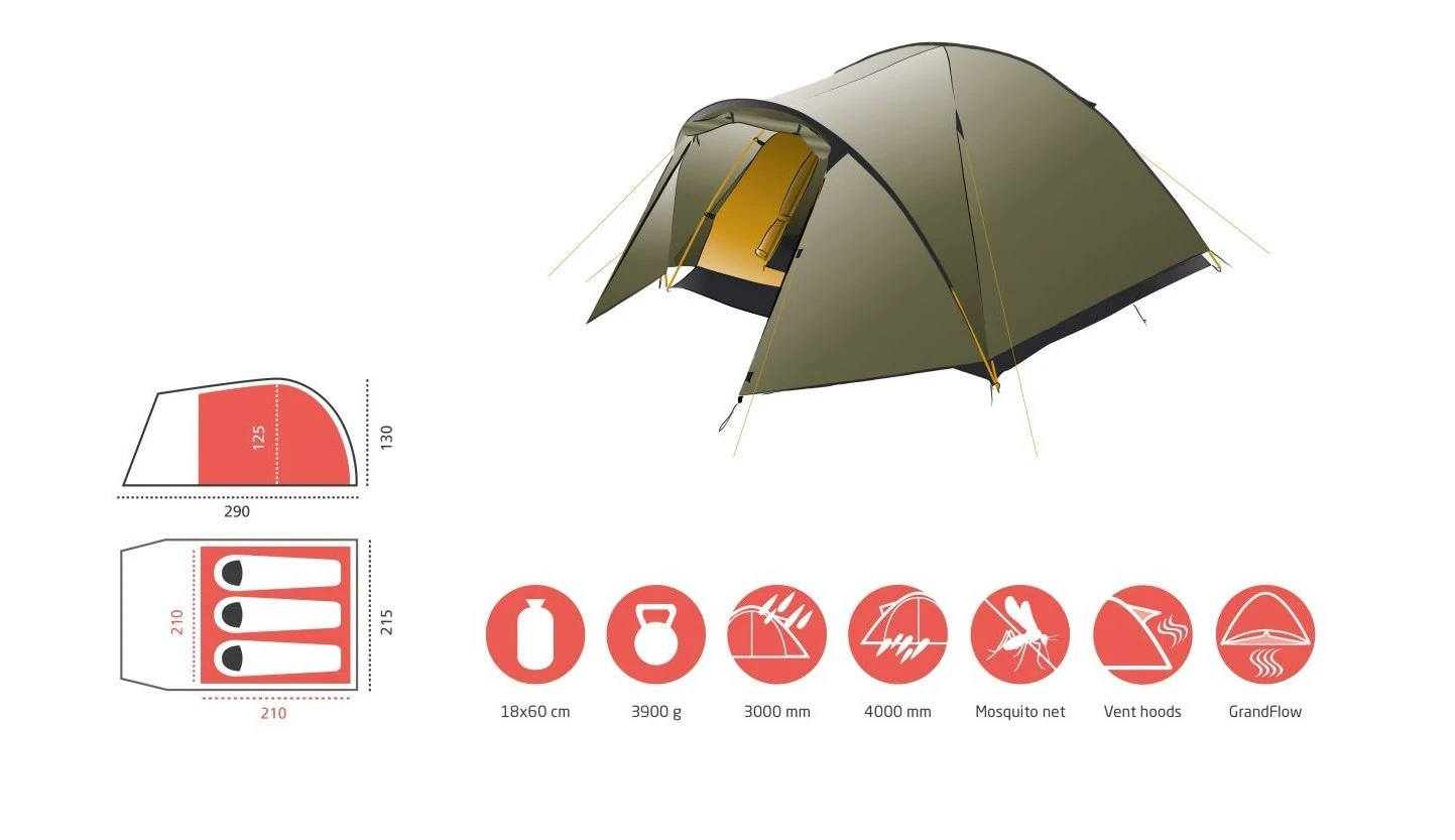 TOPEKA 3 ist ein klassisches Kuppelzelt, das ausreichend Platz bietet für drei bis vier Personen mit Ausrüstung. Mit vorderer Apsis, um das Innenzelt vor Regen zu schützen und zusätzlichen Stauraum für Gepäck oder Ausrüstung zu bieten. Hervorragendes, anpassbares Innenklima dank der neuen GrandFlow-Belüftung an der Außenplane. Das Innenzelt kann bei trockenem Wetter separat aufgestellt werden. Toll für Rad- und Kajakausflüge.