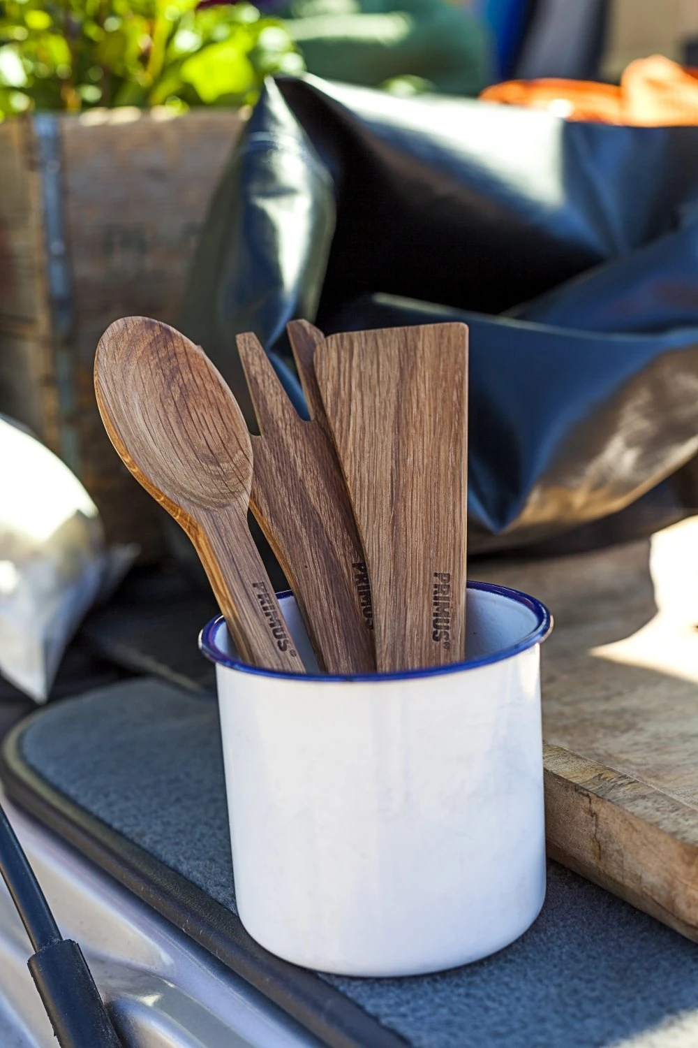 – Pfannenwender, Kochlöffel und -gabel aus robustem Eichenholz.