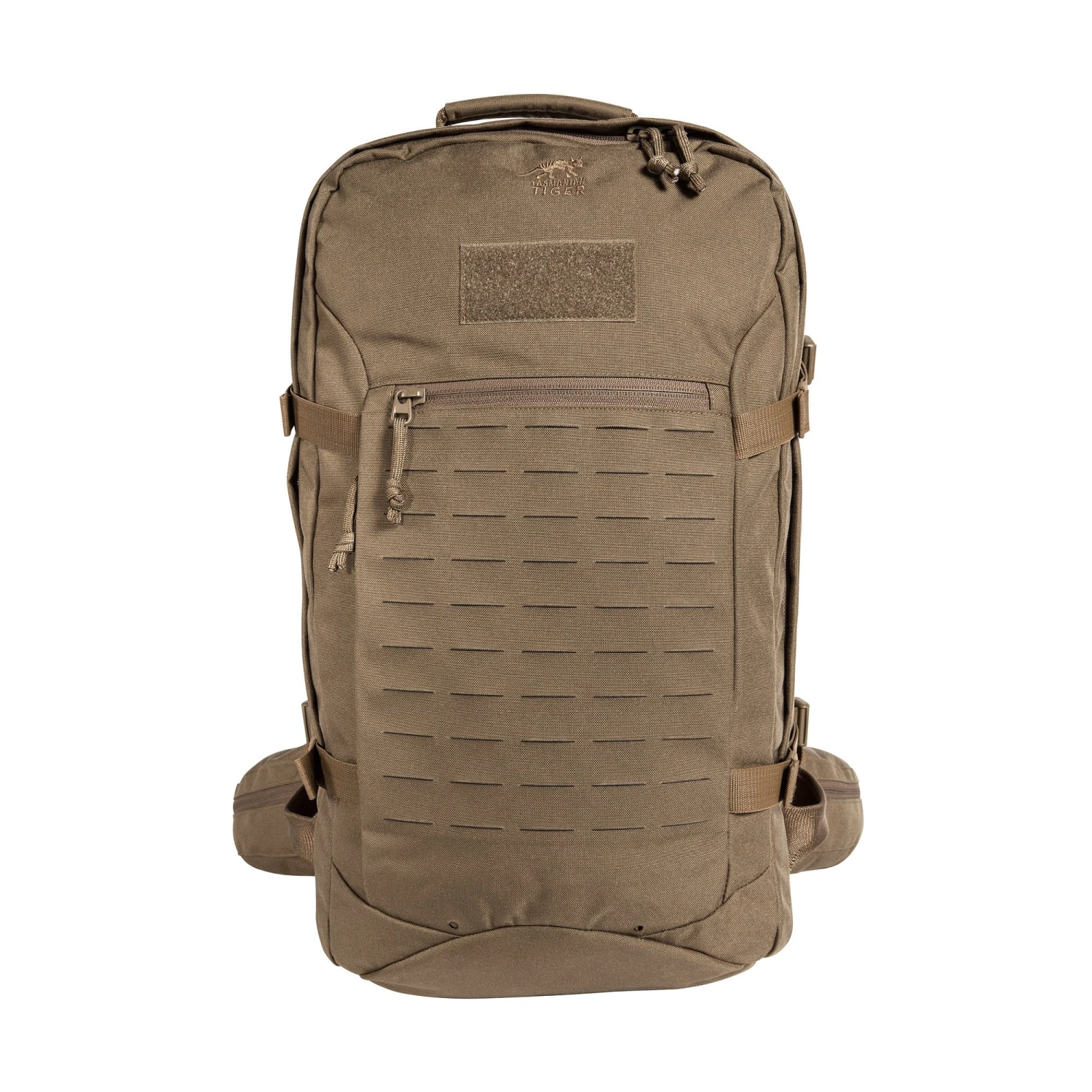 Bewährter Kampfrucksack mit 37 Liter Volumen, zwei Hauptfächern und mehreren Innentaschen. Der TT Mission Pack MK II bietet neben einer Unterteilung durch Innentaschen im rückseitigen Hauptfach auch lange Molle-Klettbänder für die individuelle Bestückung bzw. für modulare Erweiterungen. Auch im vorderen Hauptfach befinden sich drei Molle Bänder. Auf den Seiten und der flachen Reißverschluss-Fronttasche ist der Rucksack mit Molle in Lasercut-Ausführung versehen. Eine von außen zugängliche, seitliche Reißverschlusstasche ist für Dokumente vorgesehen. Der Rucksack verfügt über drei Schlauch- bzw. Antennendurchlässe in den Hauptfächern, so dass auch eine Trinkblase untergebracht werden kann. Im Bodenfach ist eine Regenhülle verstaut. Die mit Reißverschlusstaschen versehenen Hüftflügel sind abnehmbar.