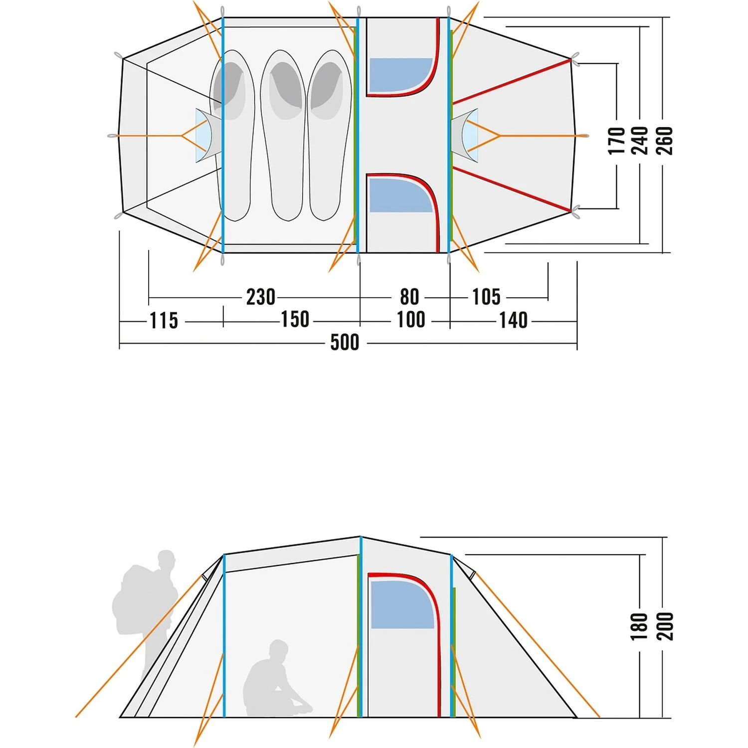 Das Tatonka Family Camp eignet sich für eine drei- bis vierköpfige Familie. Durch zwei gegenüberliegende Seiteneingänge gelangt man in die zwei Meter hohe Apside. Ein dritter Eingang befindet sich an der Frontseite. Die Schlafkabine des 3-Personen-Zelts ist so großzügig bemessen, dass selbst vier Personen ausreichend Platz finden. Verschließbare Fenster in den Seiteneingängen und an den Stirnseiten sorgen für ausreichend Licht im Zelt.