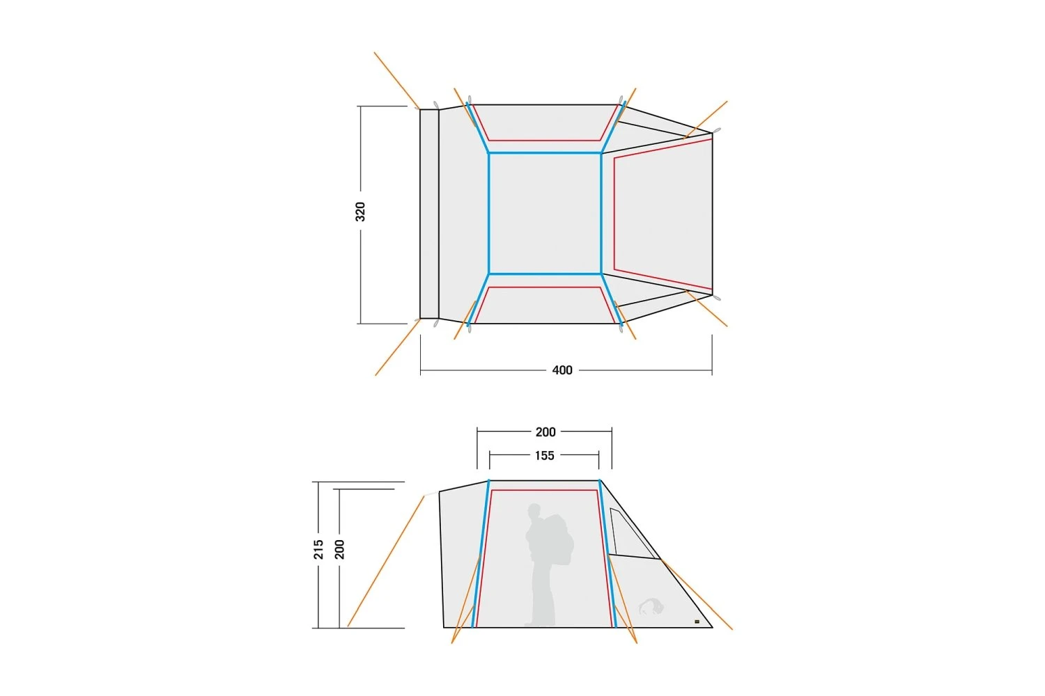 Stehhohes Vorzelt mit Tunnelkonstruktion und Zugängen von drei Seiten zum Anbau an Camping-Busse verschiedener Marken. Das Van Camp wird mit zwei Gestängebögen aufgespannt und mit einem Keder-Adapter in die Kederschiene des Busses eingezogen. Die Kederbefestigung lässt sich vom aufgestellten Zelt abzippen, so dass es auch alleine stehen kann. Das Van Camp besitzt einen Frontzugang mit Doppelreißverschluss sowie Zugänge von beiden Seiten. Alle drei Seiten lassen sich hochrollen, als Sonnendach aufspannen und mit separatem Moskitonetz verschließen. Zwei Fenster im Vorzelt sorgen für gute Lichtverhältnisse, wenn das Zelt komplett geschlossen ist. Der in der Rückwand befindliche Eingang in den Bus kann ebenfalls per Reißverschluss verschlossen werden.