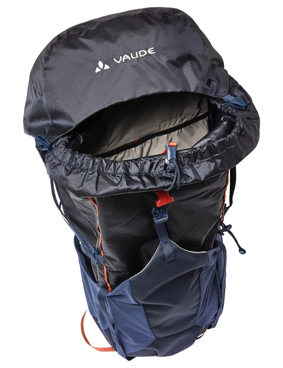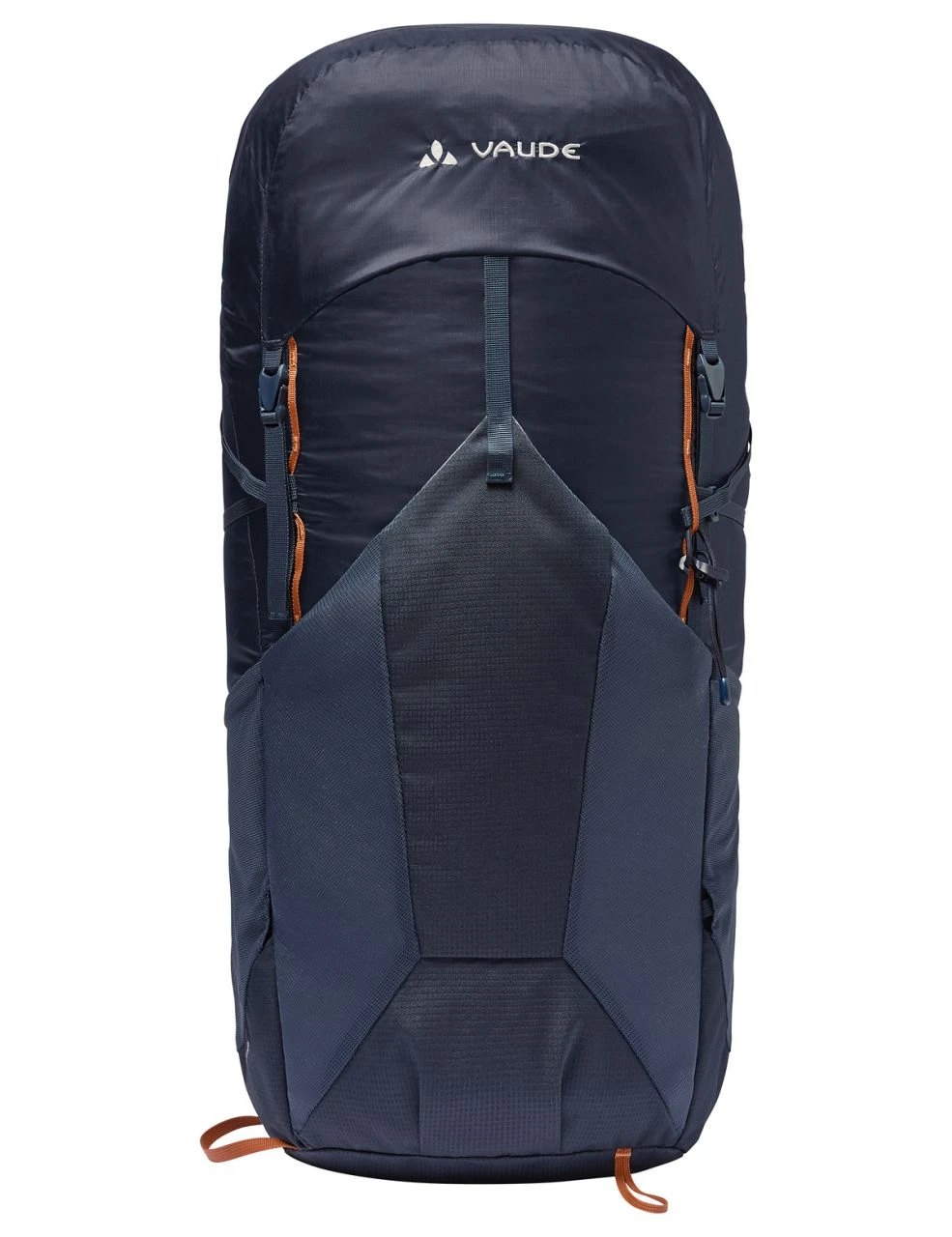 Wenn beim Trekking jedes Gramm zählt: Der Lightweight-Trekkingrucksack bietet hohen Tragekomfort bei niedrigem Gewicht – ideal für schnelle Wanderungen und zum Pilgern. Der ultraleichte Trekkingrucksack ist rückenfreundlich gepolstert: Die Aussparung am unteren Rücken mindert den Druck auf das Iliosakralgelenk und beugt Rückenschmerzen vor. Das Tergolight Comfort Space-Tragesystem verteilt die Last optimal. Rückenlänge sowie Lastenpositionierung sind individuell einstellbar. Die luftigen Ergoshape-Schultergurte des Ahead 48+ lassen dank ihrer speziellen Form genug Bewegungsfreiheit für die Arme bei steilen Aufstiegen. Energieriegel oder Handy sind in den Taschen an Schulterträgern und Hüftgurt griffbereit. Aus den elastischen Seitentaschen lassen sich Trinkflasche, Mütze usw. entnehmen, ohne den Trekkingrucksack abzusetzen. Trekkingstöcke können einfach beim Gehen befestigt werden. Feuchte Ausrüstung findet im geräumigen Frontfach Platz und trocknet dank Mesheinsätzen ab. Die variable Daisy Chain nimmt Helm und Steigeisen auf. Der Toplader hat ein extra Fach für die Trinkblase. Die Ersatzschnalle am oberen Kompressionsriemen ersetzt unterwegs eventuell defekte Schnallen. Der höhenverstellbare, abnehmbare Deckel erweitert das Volumen um weitere 8 Liter und lässt sich zudem separat als Hüfttasche tragen. Das Material des Ahead 48+ besteht aus einem Mix aus zu 100 % recyceltem Polyester sowie Polyamid mit einem biobasierten Anteil aus 62 % Rizinusöl – ein äußerst leichtes, reißfestes, nachhaltiges Material. Das VAUDE Green Shape-Label steht für ein umweltfreundliches, funktionelles Produkt aus bluesign® zertifizierten, nachhaltigen Materialien.