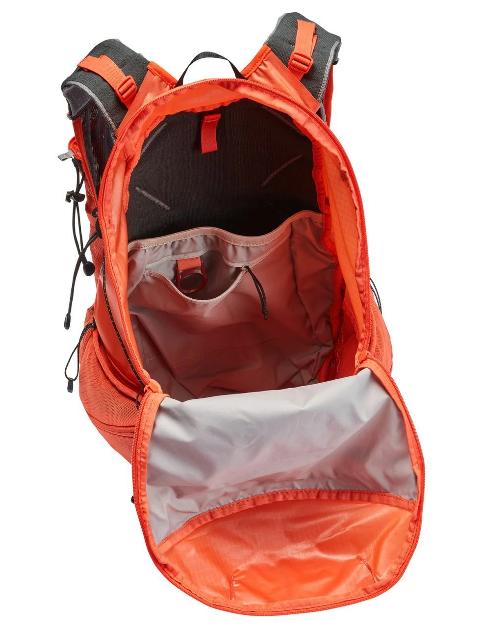 Ein perfekter Begleiter für lange, schnelle Touren: Dieser leichte Multisport-Rucksack bietet durch das 3D-formgestrickte Rückenteil maximalen Komfort, perfekten Halt und mit 18 Litern Volumen viel Platz für Speed Hiker, Mountainbiker, Langläufer und sportliche Wanderer. Die aus umweltfreundlich recyceltem Garn hergestellte 3D-Strickkonstruktion ist weltweit einzigartig: Damit werden unterschiedliche Druckzonen im Rückenbereich berücksichtigt und eine homogene Druckverteilung und Belüftung erreicht. Der Trail Spacer 18 verfügt über eine Trinkblasenvorrichtung und Stauraum für eine Tagestour. Die Schulterträger bieten Fächer mit Platz für Gels, Riegel, Handy u.a. Zwei seitliche Stretchtaschen an dem leichten Rucksack bieten weiteren Stauraum. In der Fronttasche kann eine nasse Regenjacke und das Erste Hilfe Set verstaut werden. Stockhalterung und Kompressionsriemen sind auch bei aufgesetztem Rucksack bedienbar. Für das recycelte Hauptmaterial Polyamid werden über ein zertifiziertes Massenbilanzverfahren unter anderem Altreifen verwendet. Dadurch werden bis zu 60 % CO2 eingespart. Da das Rückensystem auf Form gestrickt wird, fallen bei der Produktion keine Abfallreste an. Der Leichtrucksack ist klimaneutral: Die Emissionen aus Materialien, Herstellungsprozess und Versand wurden ganzheitlich ermittelt und systematisch reduziert. Aktuell nicht vermeidbare Emissionen wurden vollständig über die unabhängige Non-Profit-Organisation „myclimate“ kompensiert. Das VAUDE Green Shape-Label steht für ein umweltfreundliches, funktionelles Produkt aus nachhaltigen und bluesign® zertifizierten Materialien. Tipp: Rucksack immer von Hand waschen.